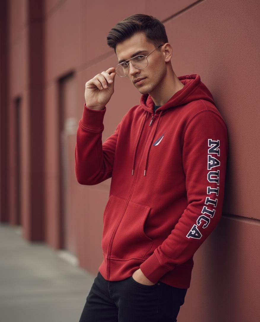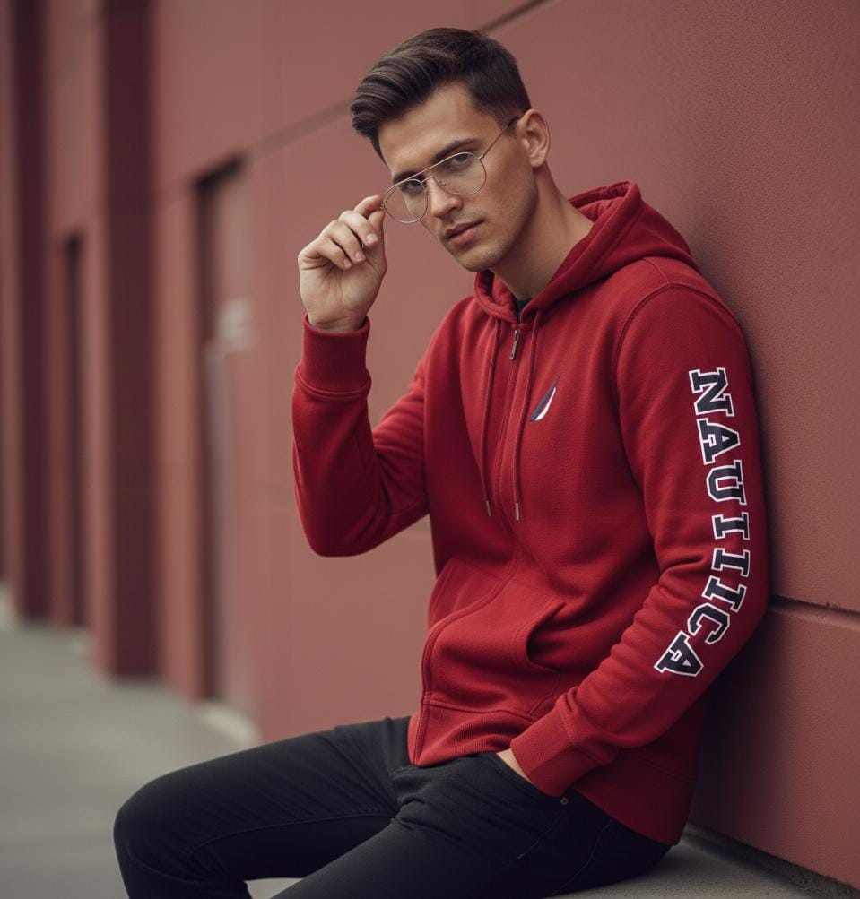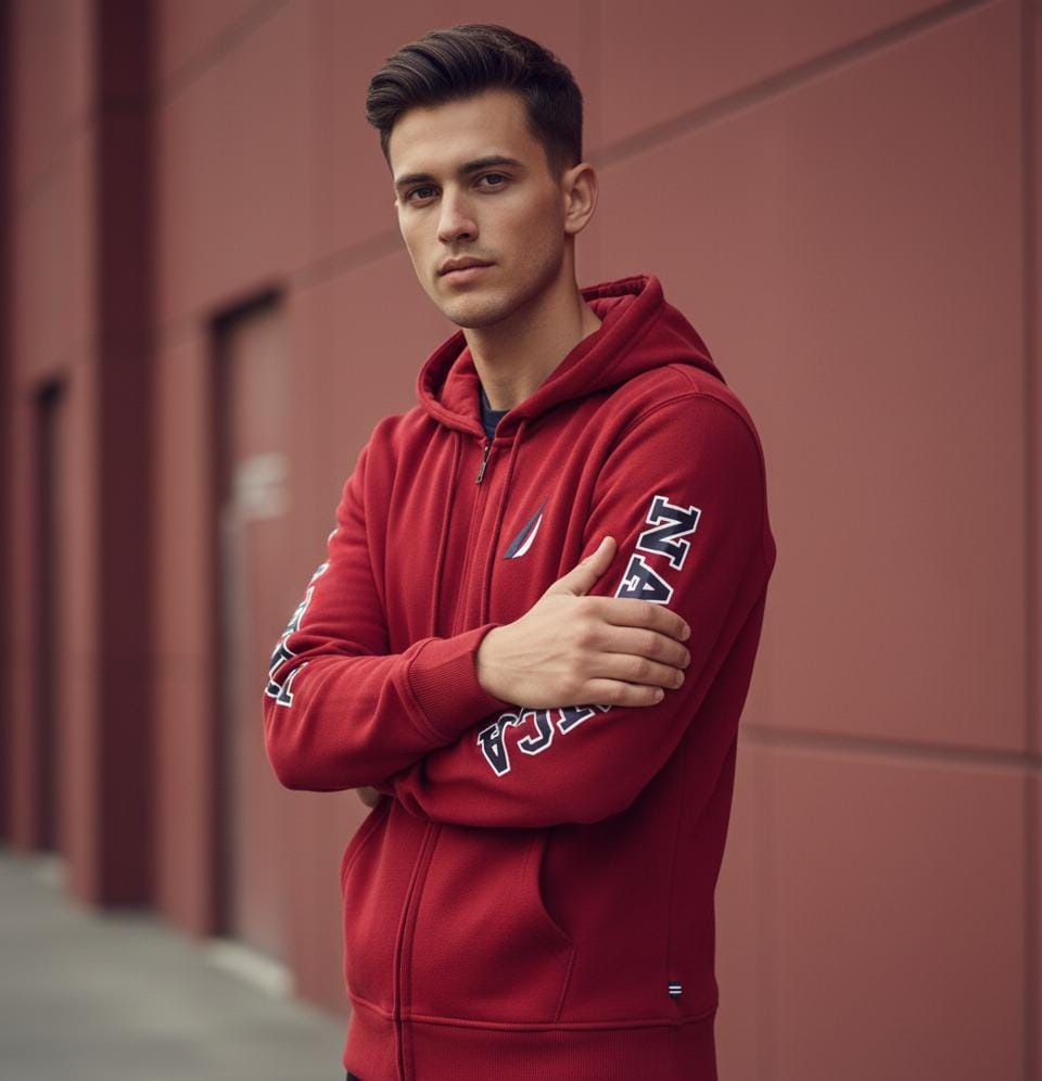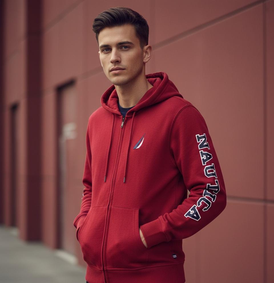 Bold Branding: Features high-impact “NAUTICA” sleeve text and the classic chest logo.